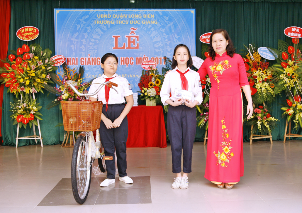 Đ.c Mai Lan trao tặng xe đạp cho em Hà Thị Cúc lớp 6D nhân dịp năm học mới.